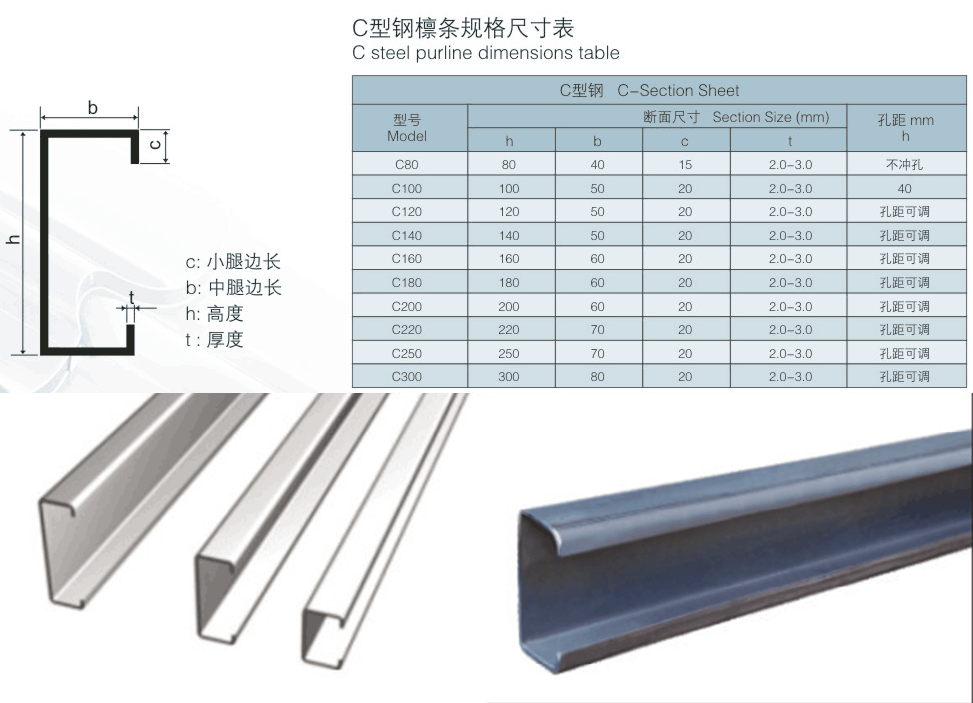 经该机辊轧的C型檩条成品具有良好的抗弯抗压性能,平直度好、全自动定长切割、自动冲孔、自动化程度高,安装快捷方便。